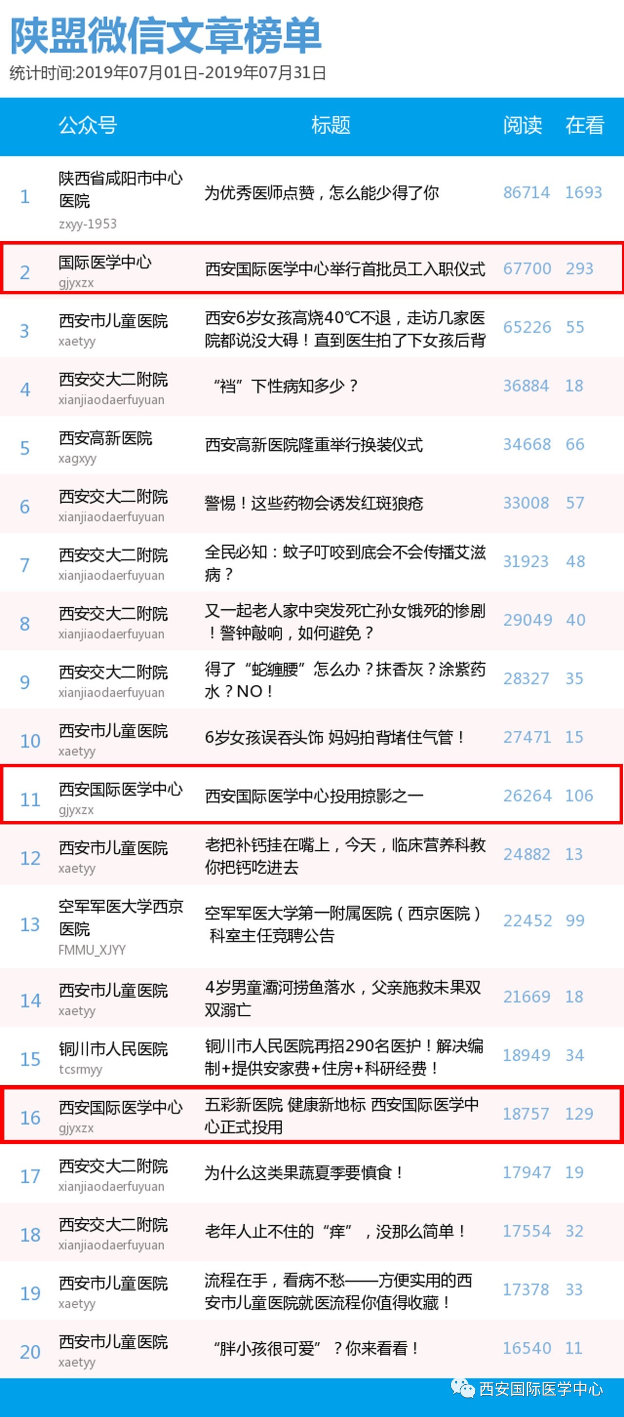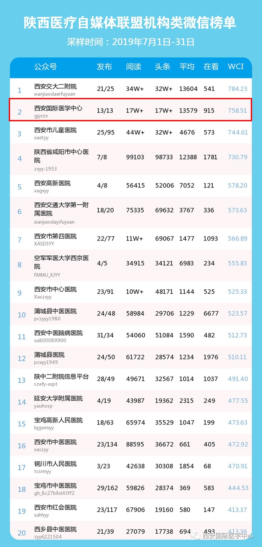 8月2日,中國醫(yī)療自媒體聯(lián)盟陜西分盟醫(yī)療機(jī)構(gòu)類微信公眾號(hào)7月份排行榜發(fā)布,西安國際醫(yī)學(xué)中心微信公眾號(hào)奪得醫(yī)療機(jī)構(gòu)類榜單第2名,高居“榜眼”。在陜西醫(yī)療自媒體聯(lián)盟的推薦下,西安國際醫(yī)學(xué)中心順利進(jìn)入今日頭條號(hào)(醫(yī)療機(jī)構(gòu)),微信文章將同步刊登到今日頭條。