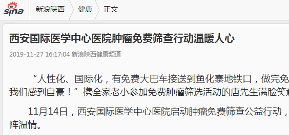 新浪網(wǎng)報(bào)道—西安國際醫(yī)學(xué)中心醫(yī)院腫瘤免費(fèi)篩查行動(dòng)溫暖人心。點(diǎn)擊閱讀。