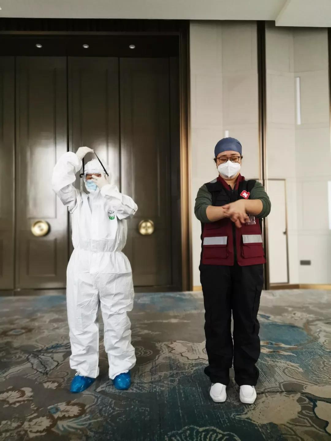 晚上十點多,大家仍然在反復(fù)溫習(xí)筆記,不斷練習(xí)穿脫防護(hù)服。穿防護(hù)服:十五個左右的步驟;脫防護(hù)服:二十多個步驟。每一個重要動作要練習(xí)上百次,穿脫幾次后,往往汗流浹背。
