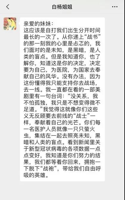 在這場(chǎng)戰(zhàn)“疫”中,我們并不孤單。尹強(qiáng)院長慰問我們醫(yī)護(hù)人員,進(jìn)入病房為患者加油打氣;楊峰副院長在生活和工作上帶給我們無微不至的關(guān)懷;劉冰主任加班加點(diǎn)為我們創(chuàng)造符合要求的工作條件;倪曉慧總護(hù)士長和王瑩護(hù)士長給我們制定各項(xiàng)流程、規(guī)章制度及應(yīng)急預(yù)案。不管是在駐地生活,還是病區(qū),都要求我們嚴(yán)格落實(shí)防護(hù)要求,按流程操作,絲毫不能放松和懈怠,只為一個(gè)都不少的安全將我們帶回。在前方有關(guān)心我們的領(lǐng)導(dǎo),后方還有支持我們的同事,每一個(gè)人都為這次疫情貢獻(xiàn)自己的一份力量。我想說:因?yàn)橛心銈?,讓我更有信心?zhàn)勝這次疫情!