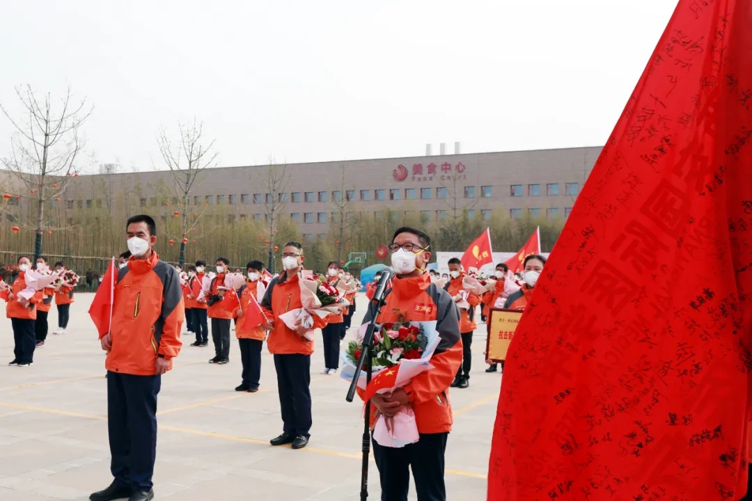 “武漢加油!湖北加油!中國必勝!”鏗鏘有力的聲音久久回蕩在萬人廣場的上空,隊(duì)員們揮舞著手中的紅旗,臉上洋溢著回家的喜悅。