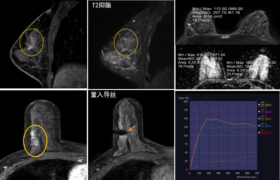 今年45歲的某女士,兩個月前行超聲檢查發(fā)現(xiàn)右乳結(jié)節(jié),乳腺X線攝影檢查提示右乳外上象限局部腺體結(jié)構(gòu)扭曲并簇狀無定形鈣化,為了進(jìn)一步評估病變性質(zhì)并確定范圍進(jìn)行了乳腺MR平掃 DWI 增強的檢查,經(jīng)MR評估發(fā)現(xiàn)右乳病變范圍較廣,評估為BI-RADS 4類可疑病變,需要取得病理學(xué)結(jié)果。