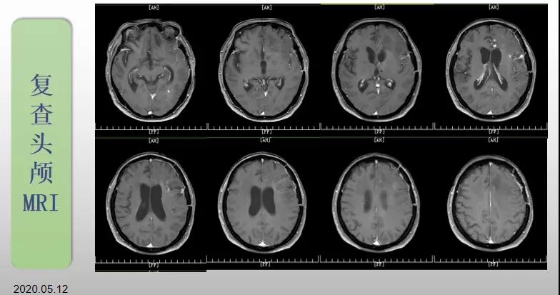 70歲的郝女士去年曾在外院查出“左額島葉”膠質(zhì)母細(xì)胞瘤(WHO Ⅳ級(jí)),并做了左側(cè)額島葉占位性病變切除術(shù)。術(shù)后進(jìn)行了同步放化療。由于治療條件有限,郝女士慕名來到我院就診。賀世明主任率領(lǐng)醫(yī)護(hù)團(tuán)隊(duì)立即為郝女士進(jìn)行了全面的檢查,決定為其進(jìn)行綜合治療 電場治療。經(jīng)過三個(gè)多月的綜合治療,患者復(fù)查頭顱MRI病變較前明顯縮小。出院時(shí),郝女士神志清醒,睡眠飲食正常,說話很流利?!拔沂翘芍M(jìn)來的,現(xiàn)在不用人攙扶,自己就可以走出病房了?!焙屡坷t(yī)護(hù)人員的手說。