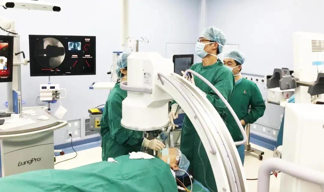4月13日,在呼吸介入室,歐陽海峰為患者全麻下行鞘管引導(dǎo)的經(jīng)支氣管鏡冷凍肺活檢術(shù)(GS-TBLC)。術(shù)中,他將鞘管引導(dǎo)的環(huán)掃超聲技術(shù)與TBCB技術(shù)結(jié)合起來,同時(shí)預(yù)置止血球囊,極大降低了患者大出血的風(fēng)險(xiǎn)。半個(gè)小時(shí)的手術(shù)非常順利。