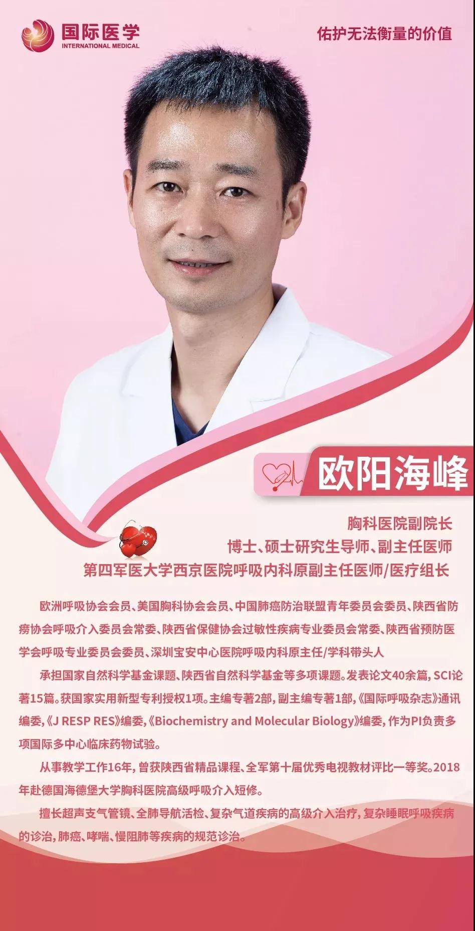 他叫歐陽海峰,中國肺癌防治聯(lián)盟青年委員會(huì)委員、陜西省醫(yī)師協(xié)會(huì)微無創(chuàng)醫(yī)學(xué)專業(yè)委員會(huì)常委、西安國際醫(yī)學(xué)中心醫(yī)院胸科醫(yī)院副院長(zhǎng)。