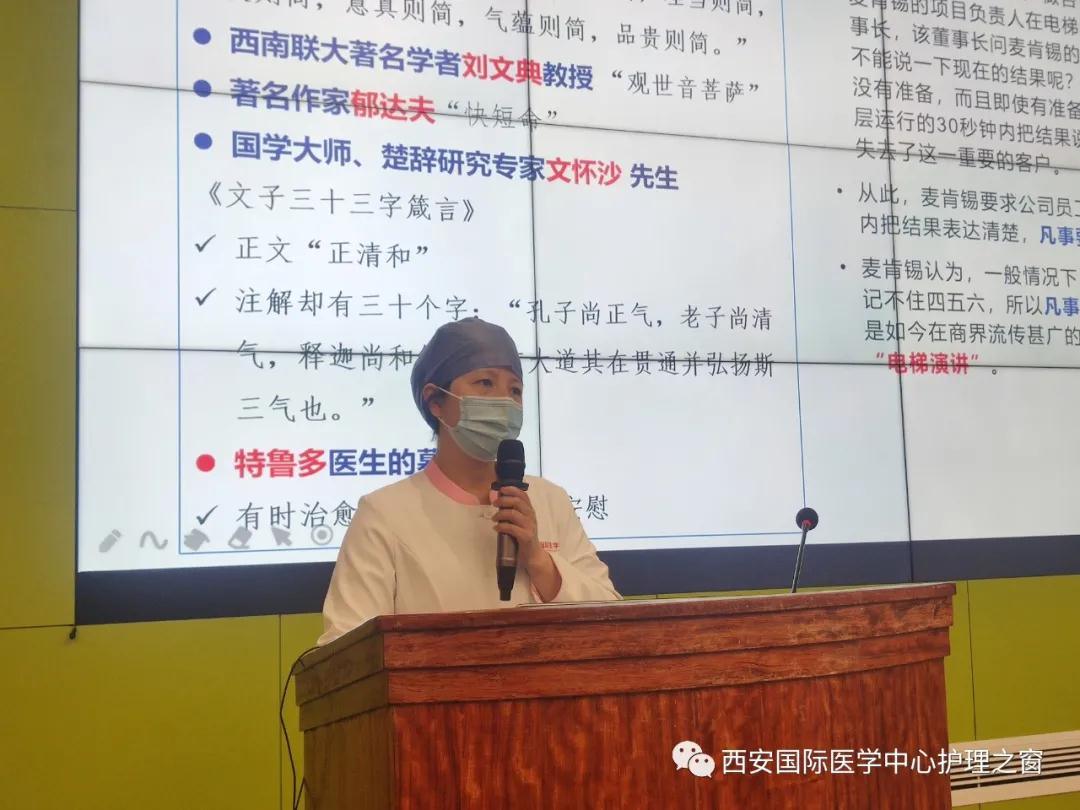 王汝娜總護(hù)士長分享了“怎樣做一名優(yōu)秀的護(hù)士長”,從護(hù)士長應(yīng)該具備的9個(gè)方面的素質(zhì)及護(hù)士長怎么實(shí)施管理等方面提出了許多真知灼見,讓護(hù)士長們備受啟發(fā),受益匪淺。
