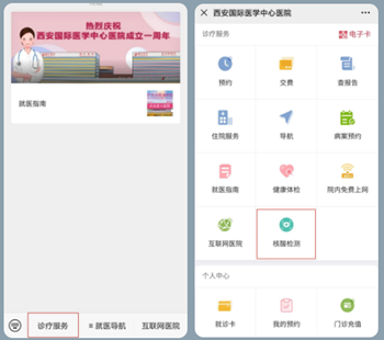 為方便患者進行核酸檢查,我院開通核酸檢測網(wǎng)上預(yù)約,并免掛號費用,患者可通過西安國際醫(yī)學(xué)中心醫(yī)院服務(wù)號進行預(yù)約和自助繳費。