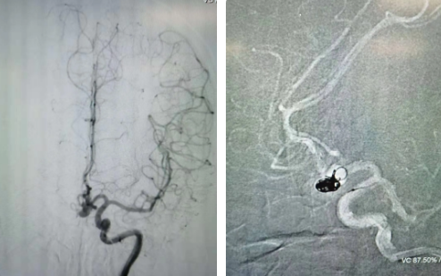 腦血管較外周血管更為脆弱、迂曲,對(duì)術(shù)者的操作技術(shù)及精準(zhǔn)性要求特別高。術(shù)中,陸丹醫(yī)生通過股動(dòng)脈穿刺、置入微導(dǎo)管,再通過微導(dǎo)管將彈簧圏送入動(dòng)脈瘤腔內(nèi),利用彈簧圈的機(jī)械閉塞作用,達(dá)到防止動(dòng)脈瘤破裂的目的。術(shù)后,患者各項(xiàng)生命體征平穩(wěn)。