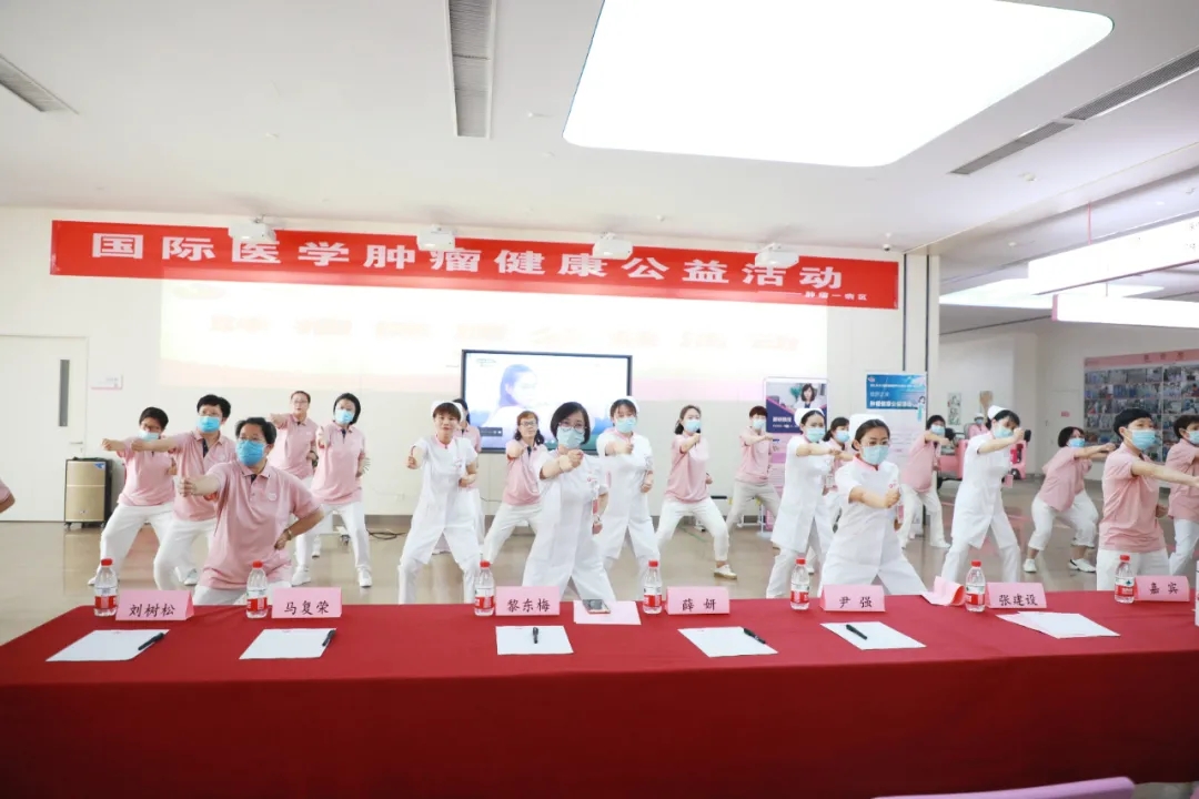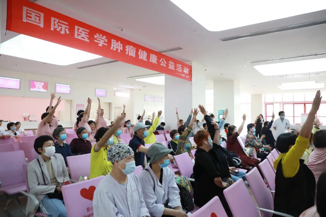 腫瘤一病區(qū)的醫(yī)護人員和志愿者們共同演練了一段八段錦,隨后的健康知識問答和歌曲快閃環(huán)節(jié)將活動氛圍推向高潮,大家爭先恐后地舉手搶答,現(xiàn)場問答也促進了對于腫瘤防治、康復知識的推廣。最后,大家合唱歌曲“相信我們會創(chuàng)造奇跡”,積極、歡樂的氛圍縈繞不息?;顒幼詈?,薛妍副院長、劉樹松教授和張俊美醫(yī)生對患者的提問進行了耐心、細致的解答。