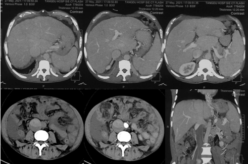 6月20日,患者及家屬懷揣著忐忑的心情來(lái)到西安國(guó)際醫(yī)學(xué)中心醫(yī)院找到韓國(guó)宏教授,韓教授詢(xún)問(wèn)病情后閱患者外院CT片,明確診斷布加綜合征,同時(shí)發(fā)現(xiàn)了一個(gè)新的問(wèn)題,在詢(xún)問(wèn)病史時(shí)了解到患者近一周雙下肢乏力伴腫脹明顯加重,遂立即安排了急診CT,證實(shí)下腔靜脈內(nèi)急性血栓形成!