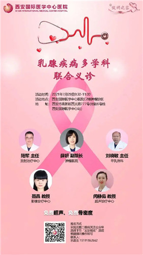 為方便患者就醫(yī),提高群眾乳腺健康意識,由西安國際醫(yī)學(xué)中心醫(yī)院腫瘤醫(yī)院、甲乳外科、放射治療中心、影像診療中心、超聲診療中心多位知名專家組成團隊,為廣大乳腺疾病患者提供全面、專業(yè)及個體化診療,并提供免費乳腺超聲和骨密度檢查,歡迎掃碼報名。