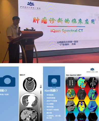 授牌儀式后即開始精彩的學術講座,首先,山西醫(yī)科大學第一醫(yī)院影像科喬英教授分享了“IQon光譜CT在腫瘤診斷的臨床應用”。喬教授指出IQon Spectral CT的光譜重建可以提供多參數數據,如單能級圖像、無水碘圖、有效原子序數值等,更加清晰的觀察病灶范圍,更加精準的發(fā)現(xiàn)小病灶、進行腫瘤分期及術后療效評估。