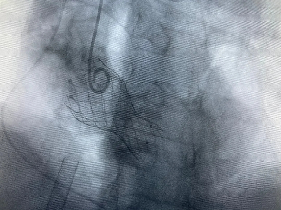 結(jié)合老人病情特點:年齡高、室壁厚、左室腔小、瓣膜鈣化嚴重,術(shù)中球囊擴張和瓣膜釋放過程有循環(huán)崩潰可能;為降低此種風險、最大程度提高手術(shù)成功率,張金洲副院長在術(shù)前組織了由楊金保博士帶領(lǐng)的TAVR團隊多次反復(fù)溝通、討論,制定了各種應(yīng)急處理方案。最終經(jīng)過TAVR團隊的默契配合,手術(shù)歷時2小時,用20#球囊預(yù)擴張后順利植入23#主動脈瓣生物瓣膜,再次后擴后主動脈根部造影顯示:人工主動脈瓣生物瓣位置良好,瓣葉開閉正常;冠脈顯影良好。經(jīng)食道超聲顯示:主動脈瓣葉活動度良好,主動脈跨瓣壓差約35mmHg,未見瓣周漏及明顯返流。出手術(shù)室前老人便已蘇醒,自訴憋悶癥狀完全消失。