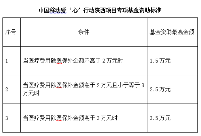 (三)項(xiàng)目實(shí)行“屬地醫(yī)保 慈善捐助 合作醫(yī)院減免”三結(jié)合的全額資助模式,受助患兒應(yīng)在合作醫(yī)院首先進(jìn)行醫(yī)保結(jié)算;醫(yī)保結(jié)算剩余部分,由中國移動愛‘心’行動專項(xiàng)基金按最高限價(jià)標(biāo)準(zhǔn)進(jìn)行結(jié)算,其余超出治療費(fèi)用由合作醫(yī)院減免,同一救助對象1年內(nèi)只給予一次救助。