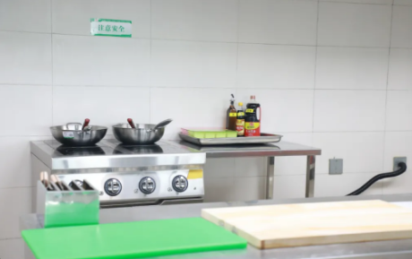 在“愛(ài)心廚房”我們發(fā)現(xiàn),廚房配備了廚具、電器設(shè)備、鍋碗瓢盆,常用調(diào)料等。