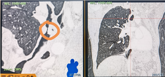 時(shí)間就是生命!了解患者病情后,歐陽海峰立刻啟動(dòng)氣道梗阻緊急救治通道,協(xié)調(diào)院前轉(zhuǎn)運(yùn),急診快速入院流程。凌晨患者入院胸部CT顯示,現(xiàn)存唯一的呼吸通道在右主支氣管處,狹窄處僅約3毫米,患者命懸一線!