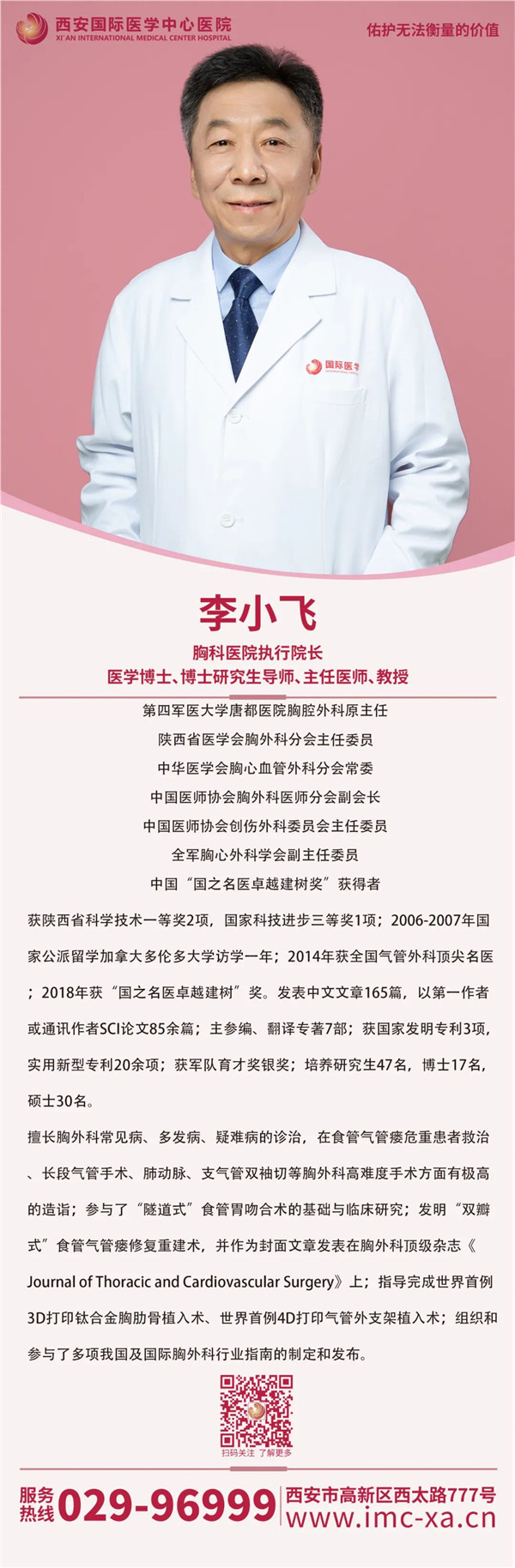 2021年11月,李小飛來到西安國際醫(yī)學(xué)中心醫(yī)院任胸科醫(yī)院執(zhí)行院長。李小飛兢兢業(yè)業(yè)、忘我工作,只為患者重返健康,感受生命的美好;勇于創(chuàng)新、不辭辛勞,只為攻克醫(yī)學(xué)難題而前行;醫(yī)者仁心、大志于胸,為更多的患者保駕護(hù)航,為他們帶來重生和希望。