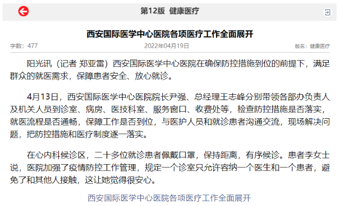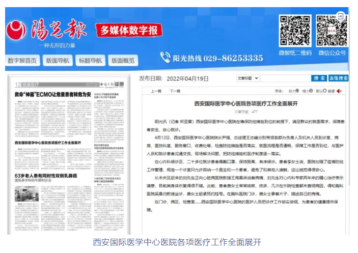 陽光報:西安國際醫(yī)學中心醫(yī)院各項醫(yī)療工作全面展開