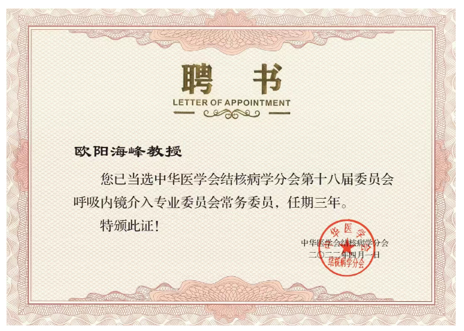 2022年4月,中華醫(yī)學(xué)會(huì)結(jié)核病學(xué)分會(huì)進(jìn)行換屆工作。西安國(guó)際醫(yī)學(xué)中心胸科醫(yī)院歐陽(yáng)海峰副院長(zhǎng)當(dāng)選為“呼吸內(nèi)鏡介入專業(yè)委員會(huì)常務(wù)委員”。