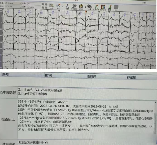 檢查前,心電檢查中心醫(yī)生仔細(xì)詢問患者病史,并簽署知情同意書后,進(jìn)行正式檢查。打開錄播系統(tǒng)及傾斜試驗(yàn)系統(tǒng),心電檢查中心張錄興主任帶領(lǐng)兩位醫(yī)生進(jìn)行看護(hù),傾斜前及傾斜后密切觀察患者的心率、血壓和自身狀態(tài)。當(dāng)傾斜70?后4分鐘患者心率及血壓開始變化,自述頭暈想吐。即可恢復(fù)平臥位后測量血壓,患者出現(xiàn)體位變化后發(fā)生嘔吐,伴隨心率由快變慢,并出現(xiàn)明顯竇性心動過緩伴不齊,最慢可達(dá)46次/分,嘔吐過后心率逐漸上升90次/分,患者自述暈厥癥狀消失,血壓心率平穩(wěn)后,試驗(yàn)結(jié)束,診斷暈厥試驗(yàn)可疑陽性。