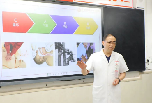 西安國(guó)際醫(yī)學(xué)中心醫(yī)院麻醉手術(shù)中心副主任王彬榮以“基礎(chǔ)生命支持”為主題,給老師們?cè)敿?xì)介紹了現(xiàn)場(chǎng)急救、復(fù)蘇的定義和基本流程,并進(jìn)行現(xiàn)場(chǎng)演示。