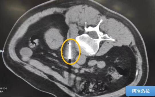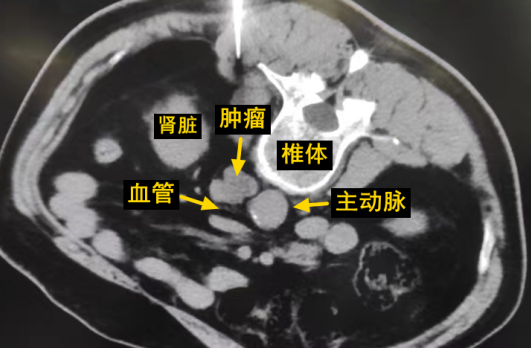 經(jīng)過多學(xué)科討論,陳寶瑩主任根據(jù)影像資料指出,患者轉(zhuǎn)移瘤位于腹膜后,內(nèi)側(cè)瀕臨人體最大的血管——主動(dòng)脈;前方同樣有血管緊貼腫瘤;外側(cè)是腎臟,后方是椎體和神經(jīng),夾縫中進(jìn)針難度大,治療時(shí)要避免周圍重要臟器、血管和神經(jīng)的損傷,因此可以選擇CT引導(dǎo)下精準(zhǔn)穿刺活檢同步冷凍消融治療,即獲得病理組織有利于下一步全身治療方案的調(diào)整,同時(shí)殺死腹膜后轉(zhuǎn)移瘤,周圍正常組織損傷的可能性也小。