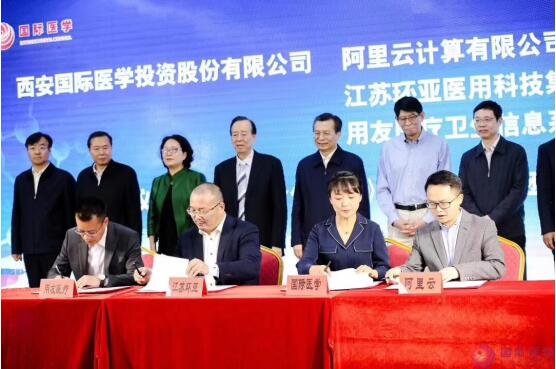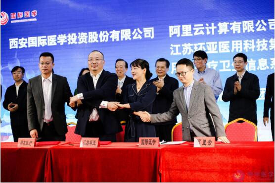 王永康書記等領(lǐng)導(dǎo)和嘉賓們首先參加了西安國際醫(yī)學(xué)中心的項(xiàng)目封頂儀式。在打造“ 一帶一路”國際醫(yī)療中心的啟動(dòng)儀式上,國際醫(yī)學(xué)董事長史今代表公司與西安電子科技大學(xué)校長楊宗凱、英國國王學(xué)院代表簽訂《共建國際醫(yī)學(xué)院合作框架協(xié)議》;與阿里云簽訂《落地實(shí)施協(xié)議》、與江蘇環(huán)亞簽訂《信息化合作協(xié)議》、與用友醫(yī)療簽訂《信息化集團(tuán)管控項(xiàng)目實(shí)施協(xié)議》。